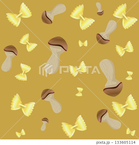 Square image of repeated bow tie pasta shapes and brown mushrooms on mustard yellow background