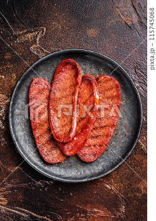 Grilled Turkish Sucuk meat sausage. Dark background. Top view