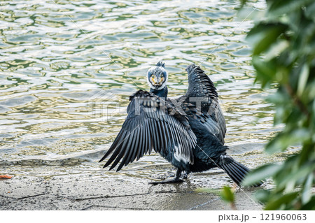 水辺で羽を広げるカワウ 大阪市土佐堀川 中之島公園