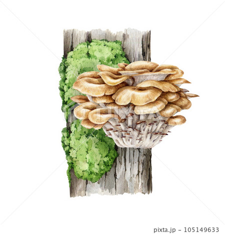 Maitake mushroom on a mossy tree trunk. Watercolor illustration. Hand painted Grifola frondosa fungi. Maitake fresh mushrooms grows on a tree. Hand drawn natural image. White background
