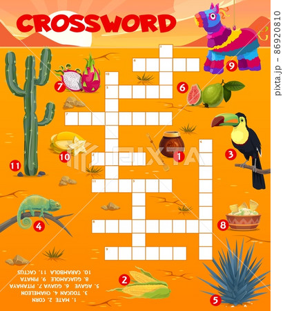 Crossword grid worksheet with mexican food, animals and items. Find a word quiz game, children text riddle or kids puzzles book vector page with toucan, cactus and chameleon, agave, pinata and fruits
