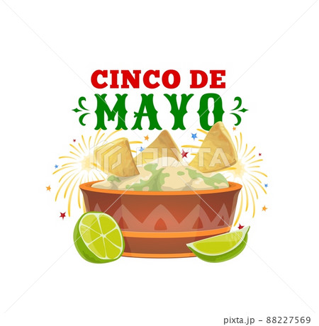 Cinco de Mayo holiday vector design, Mexican guacamole, nachos and lime. Festive food of Mexico fiesta party, avocado dip in bowl with corn chips and fireworks, Cinco de Mayo greeting card design