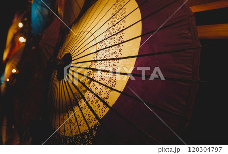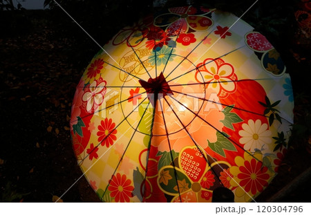 暗闇に浮かび上がる紫色の和傘のイルミネーション