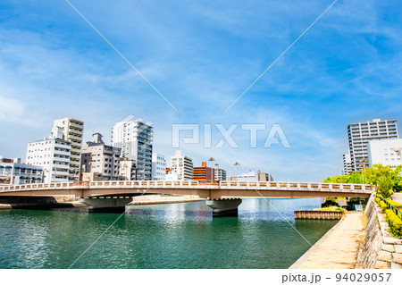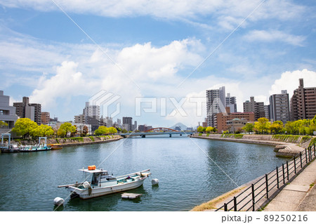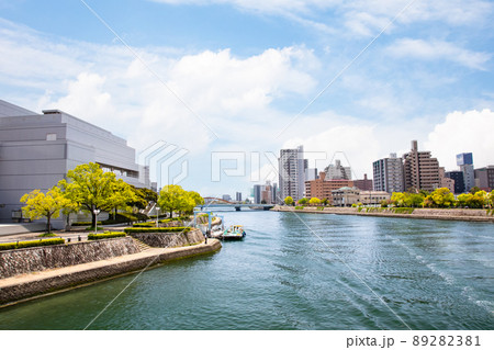 広島の市街地風景です。アステールプラザが見える本川沿いです。明るく広々した雰囲気をどうぞ。広島県