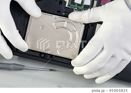 Technician hands removing an old mechanical hard disk from a laptop. Top view