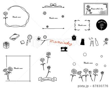 母の日のイラストセット。カーネーションや薔薇の花、リボンの飾り素材。女性物のバッグや靴、化粧品やエプ
