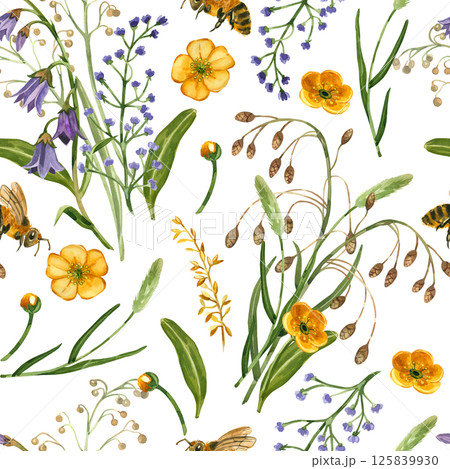 Seamless watercolor pattern. Meadow flowers and grasses, yellow buttercups, purple bluebells, bee, green leaves. All objects are hand-painted in watercolor. For printing on fabric, paper, bed linen.