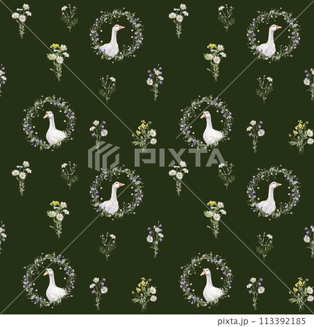 Seamless pattern with wreath of buttercup and flower and bluebell. Domestic watercolor goose. Watercolor hand painting illustration on isolate. Circlet of meadow flowers. Botanical summer wildflowers.