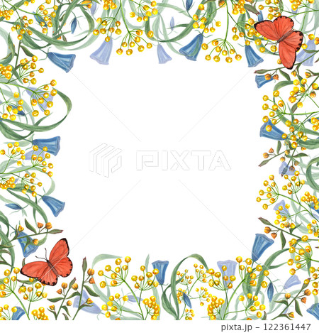 Blooming campanula, wild oats, flying butterflies. Floral square frame. Watercolor illustration for greeting, invitation template, celebration cards. Space for text