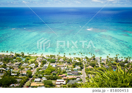 ハワイの休日 青空と海と白い砂浜 オアフ島ベローズビーチから望むモクルア島