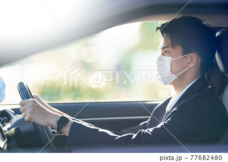 タクシーに乗ってスマホを見るマスク姿の若い男性