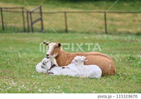 お母さんに甘える赤ちゃんヤギ(ヤクシマヤギ)秩父高原牧場・彩の国ふれあい牧場・埼玉県