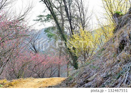 早春の春を彩る 一面の黄花の群生 花桃の里 東秩父村