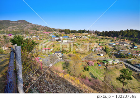 埼玉県秩父郡東秩父村大内沢花桃の郷 早春の里山の斜面に咲き乱れる花桃などの花
