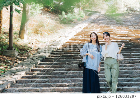 奈良公園で鹿せんべいを鹿にあげる女性(友達)