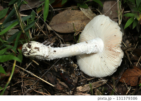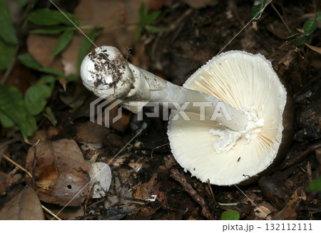 秋の雨後落葉土壌に立派な風格のコテングタケモドキキノコ(ヒダと柄・自然下菌キノコ類マクロ撮影)