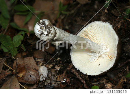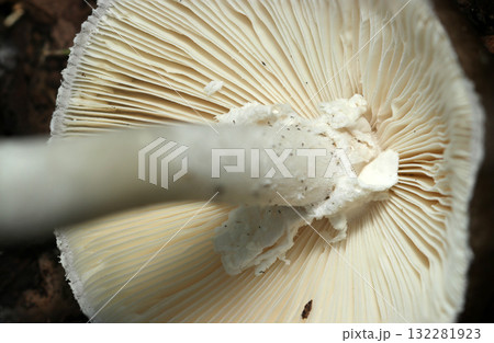 コテングタケモドキキノコの白いヒダ・内皮膜・柄アップ(アウトドアフィールド菌&キノコ類マクロ撮影)