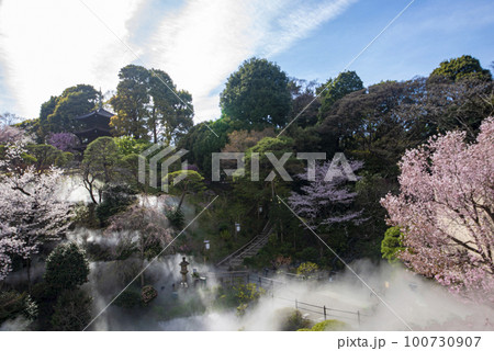 「東京雲海」に包まれた、登録有形文化財の三重塔がある、椿山荘の桜の咲く庭園の、「空中庭園」からの眺め