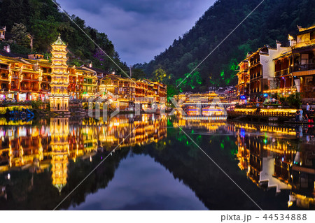 中国湖南省・ライトアップされた夜の鳳凰古城 / Fenghuang, China