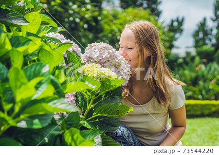 Young woman on the background of light Pink hydrangea blooming in the garden