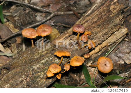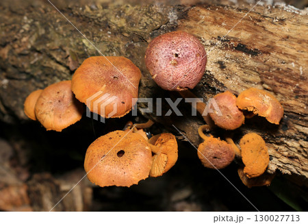 朽木に群生する老成したチャツムタケ属老菌キノコ(自然環境下マクロ撮影)