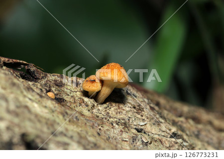 かわいいオレンジ色のチャツムタケ(属)キノコの赤ちゃん幼菌(自然環境下ストロボマクロ撮影)