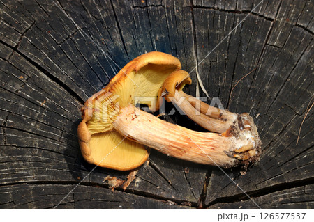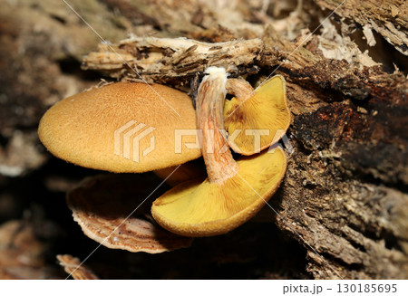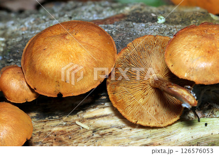 朽木に群生する明るい山吹色のチャツムタケ属成菌キノコの柄とカサ裏ヒダデザイン(自然環境下マクロ撮影)