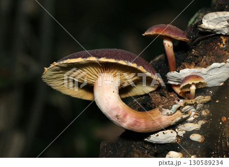 真横からみた平たいカサのムラサキチャツムタケキノコ株(アウトドアフィールド菌&キノコ類マクロ撮影)