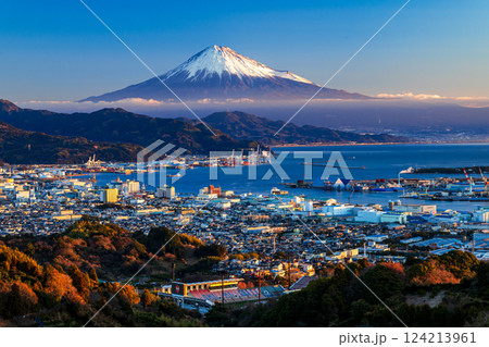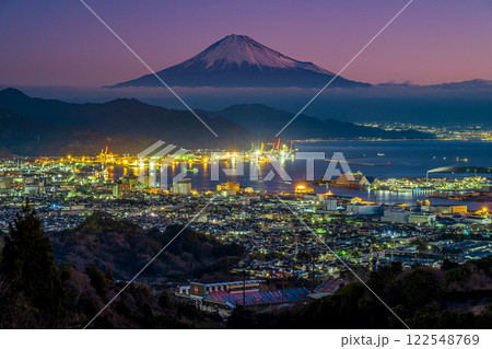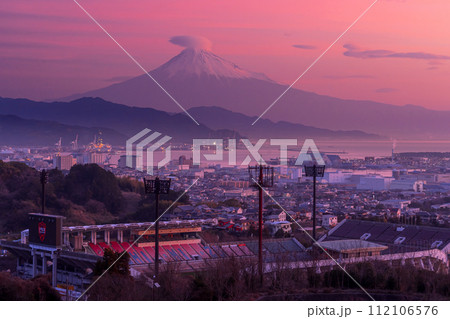 朝焼け始まる日本平から望む清水港とIAIスタジアムに富士山