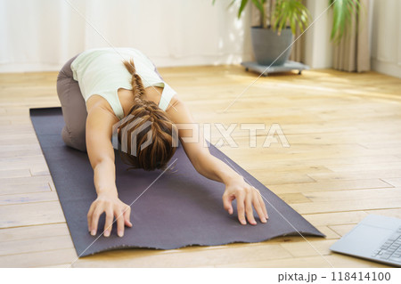 オンラインヨガサロン配信でポーズを見せる若い女性