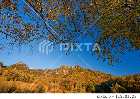 南アルプス・仙丈ヶ岳・馬ノ背のダケカンバの黄葉と鋸岳