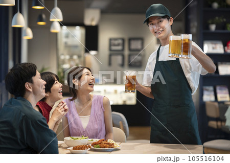 飲食店イメージ テーブルのお客さんにビールのジョッキを運ぶホールスタッフ