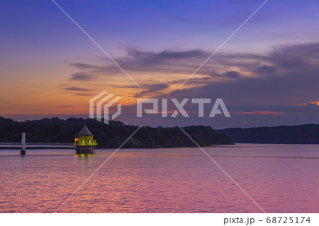新緑の狭山丘陵にある多摩湖 堰体から見る取水塔と反射する湖面