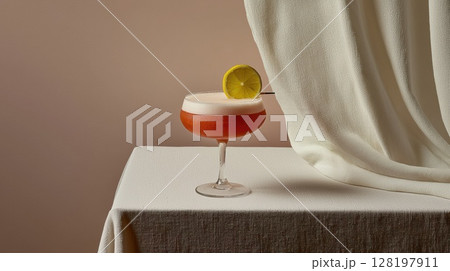 Savor the refreshing guava collins cocktail served on a white linen table with soft pastel backdrop