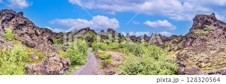 Panoramic view Dimmuborgir lava fields Iceland under blue sky
