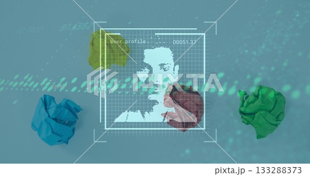 Displaying grid overlay showing silhouette and ID on turquoise backdrop with data dots, paper balls