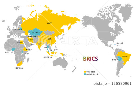 世界地図とBRICSの加盟国、2025年5月現在、大平洋