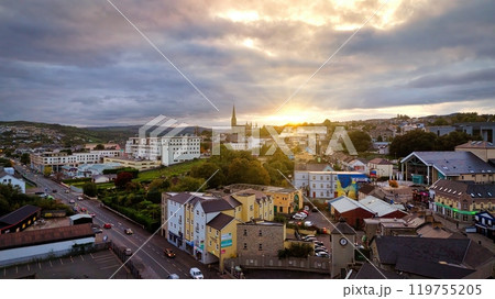 Aerial view over the town of Letterkenny in Ireland in the evening - a breathtaking scenic cityscape