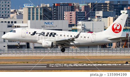雨の大阪空港・伊丹空港に着陸する旅客機・飛行機・J-AIRエンブライエル190
