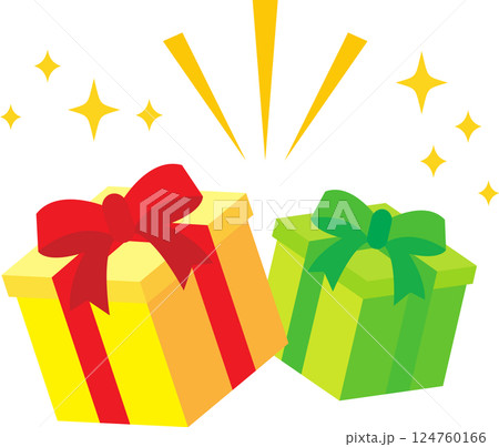 かわいいプレゼントの箱から中身が飛び出すイラスト_赤いリボンと黄色い箱