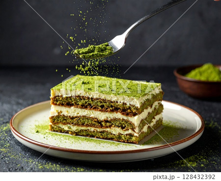 和風の抹茶ティラミスに舞う抹茶パウダーの瞬間11 AI生成画像