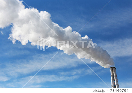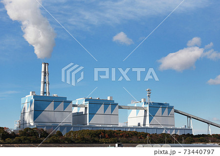 【火力発電所と青空に流れる煙突の煙】