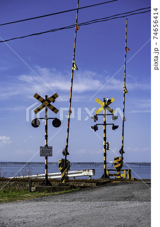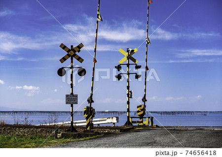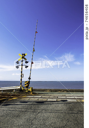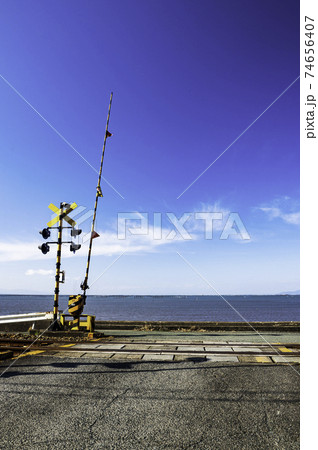 晴天の青空に白い雲有明海の青い海が見える三角線の踏切風景