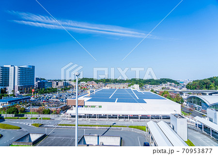 日本の川崎都市景観 東急電鉄 溝の口駅前や太陽光パネルなどを望む