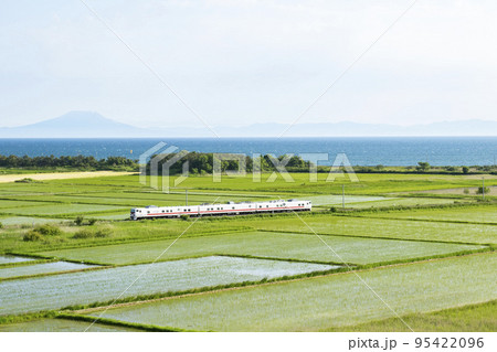 噴火湾沿いの田園を走る室蘭本線特急スーパー北斗号