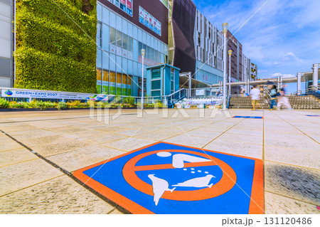 日本の横浜都市景観ハトにエサを与えないで!。戸塚駅・西口駅前デッキなどを望む