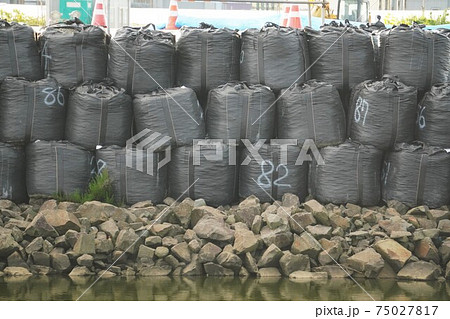 復興工事現場の土のう/Some sandbags at reconstruction site of
