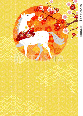 和柄の背景と馬を組み合わせた午年に使える年賀状のテンプレート