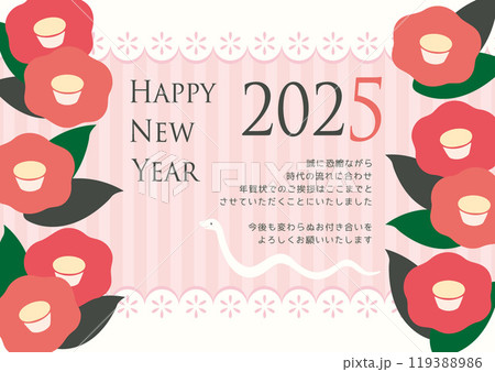 巳年の蛇と紅白ストライプ模様の可愛い年賀状テンプレート 年賀はがき 2025年 令和七年