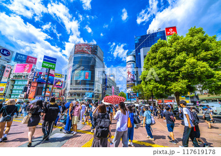 日本の東京都市景観8月・インバウンド復活…外国人観光客らで賑わう渋谷スクランブル交差点…=20日